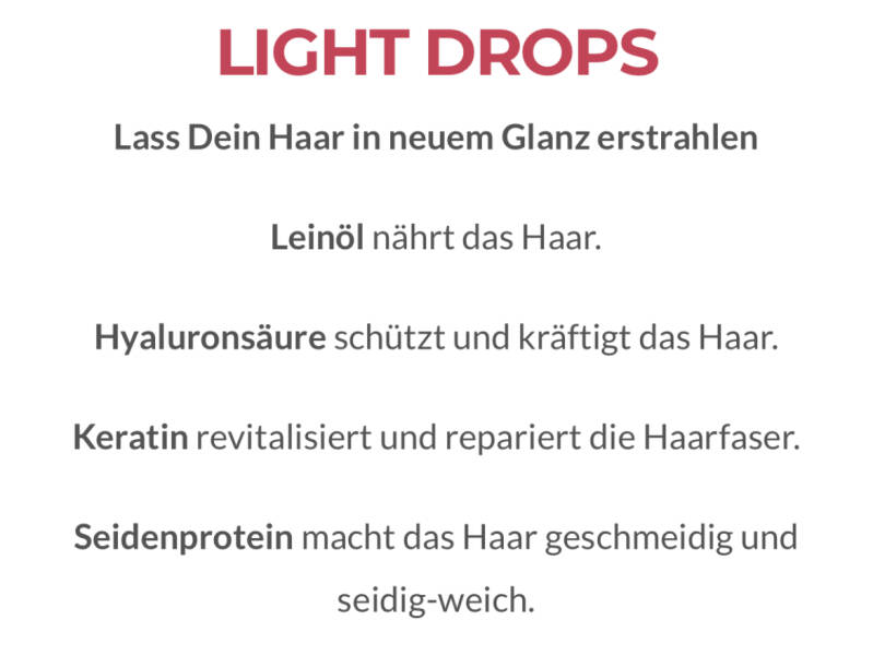 LIGHT DROPS – FLÜSSIGKRISTALLE FÜR HAARE - 50 ML Angereichert mit Leinöl, Keratin, Hyaluronsäure & Seidenprotein 29,90 €inkl. MwSt zzgl. Versandkosten