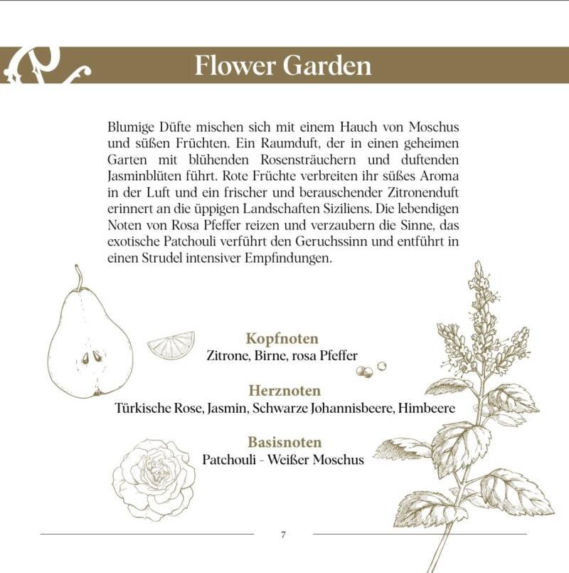 Blumige Düfte mischen sich mit einem Hauch von Moschus und süßen Früchten. Ein Raumduft, der in einen geheimen Garten mit blühenden Rosensträuchern und duftenden Jasminblüten führt. Rote Früchte verbreiten ihr süßes Aroma in der Luft und ein frischer und berauschender Zitronenduft erinnert an die üppigen Landschaften Siziliens. Die lebendigen Noten von Rosa Pfeffer reizen und verzaubern die Sinne, das exotische Patchouli verführt den Geruchssinn und entführt in einen Strudel intensiver Empfindungen.